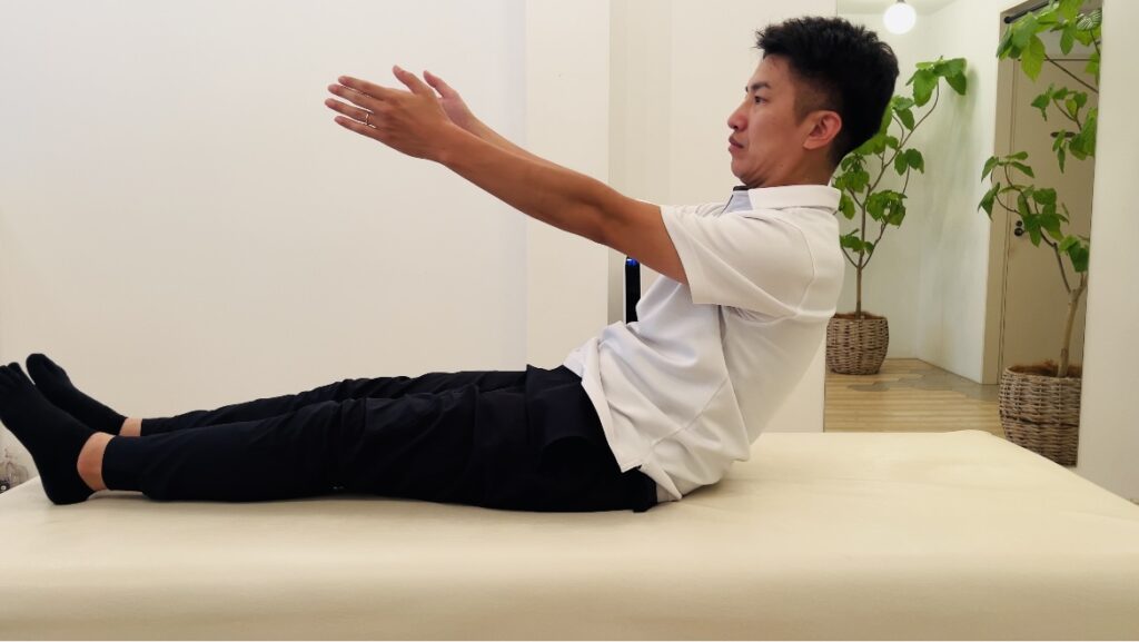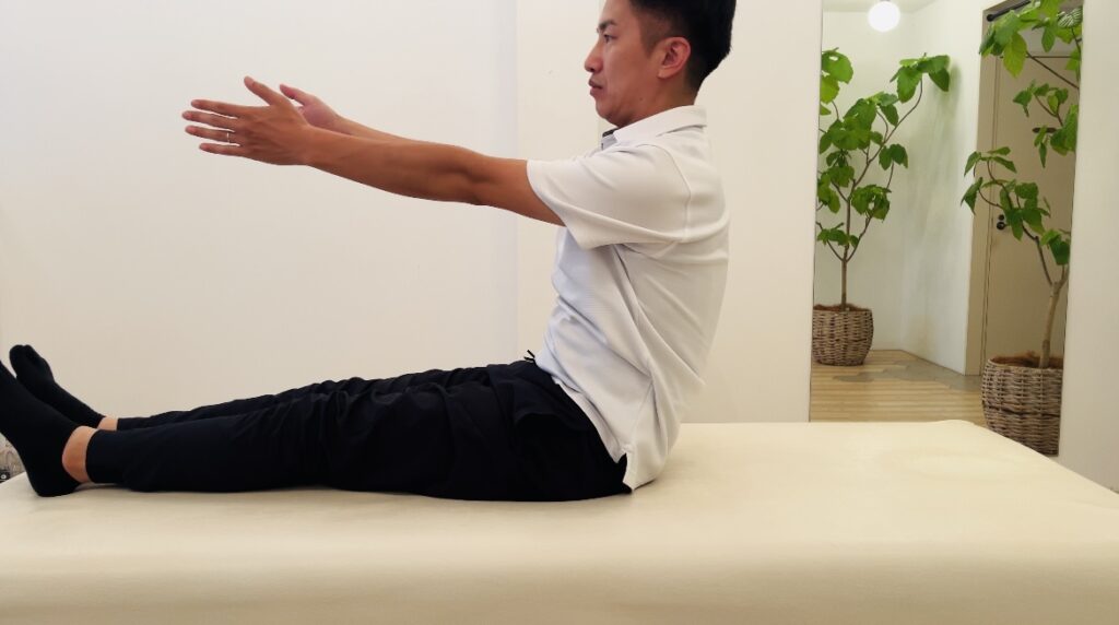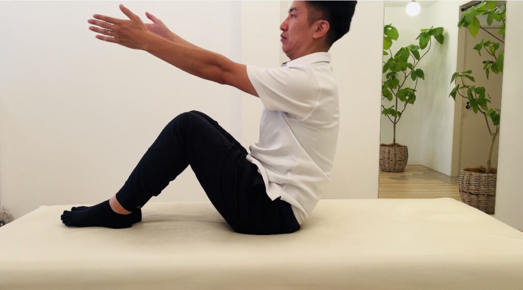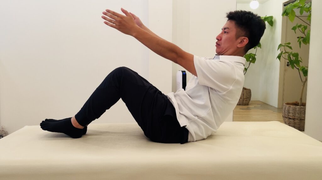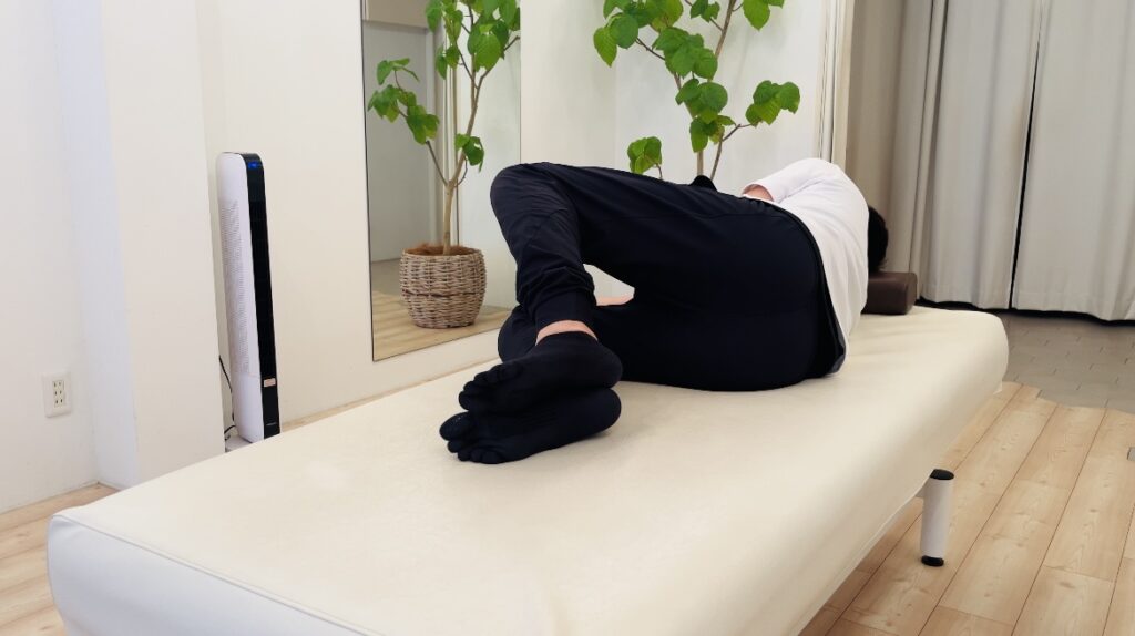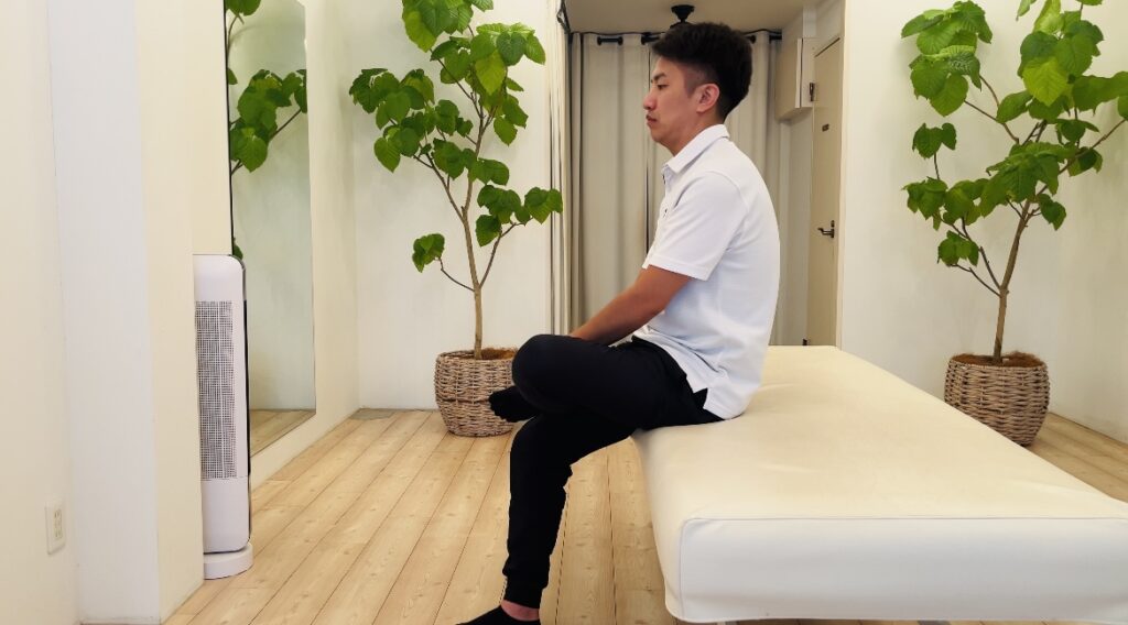 膝を曲げた状態から、後方に体重移動して5秒キープします。