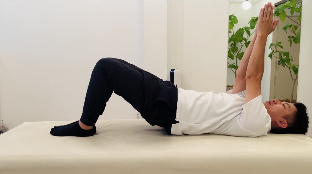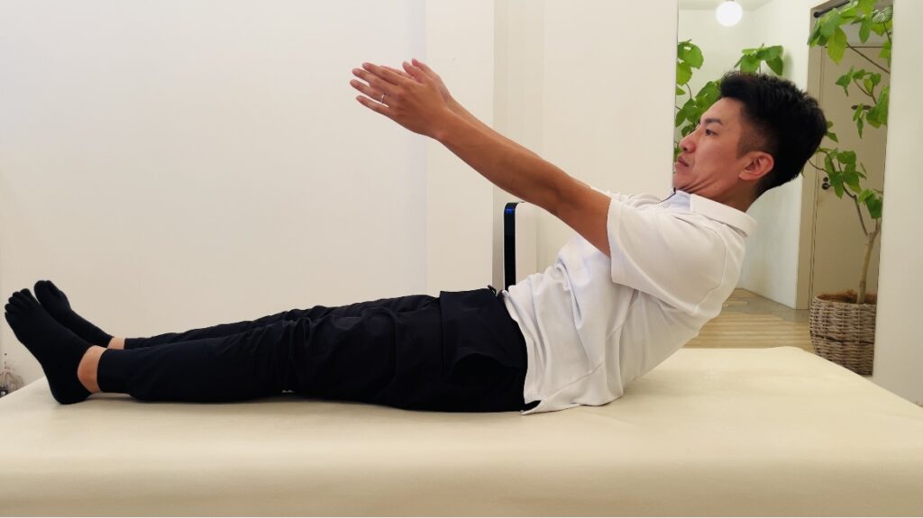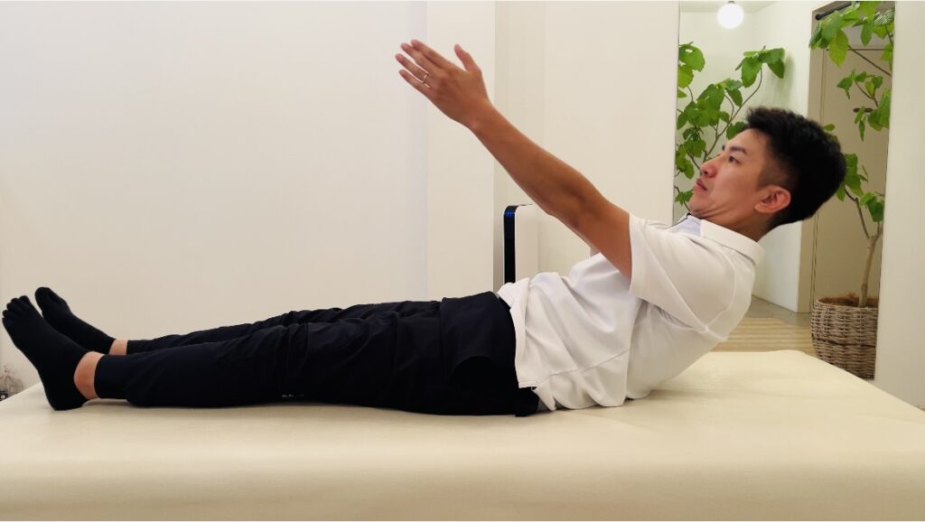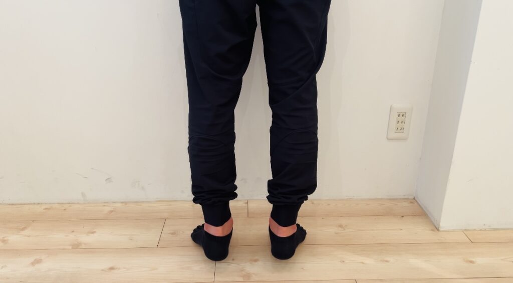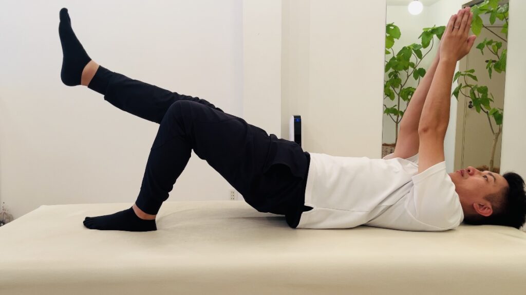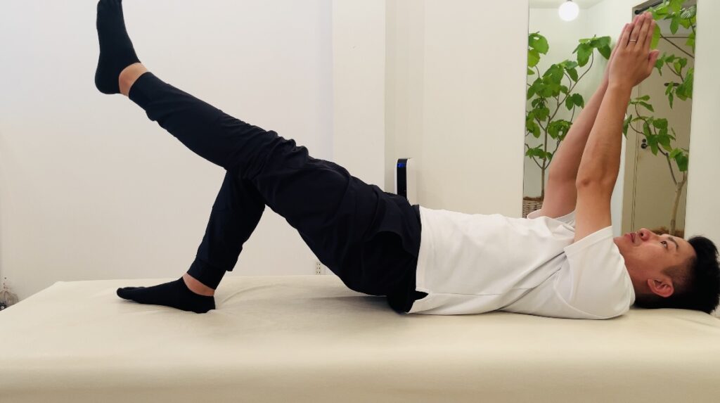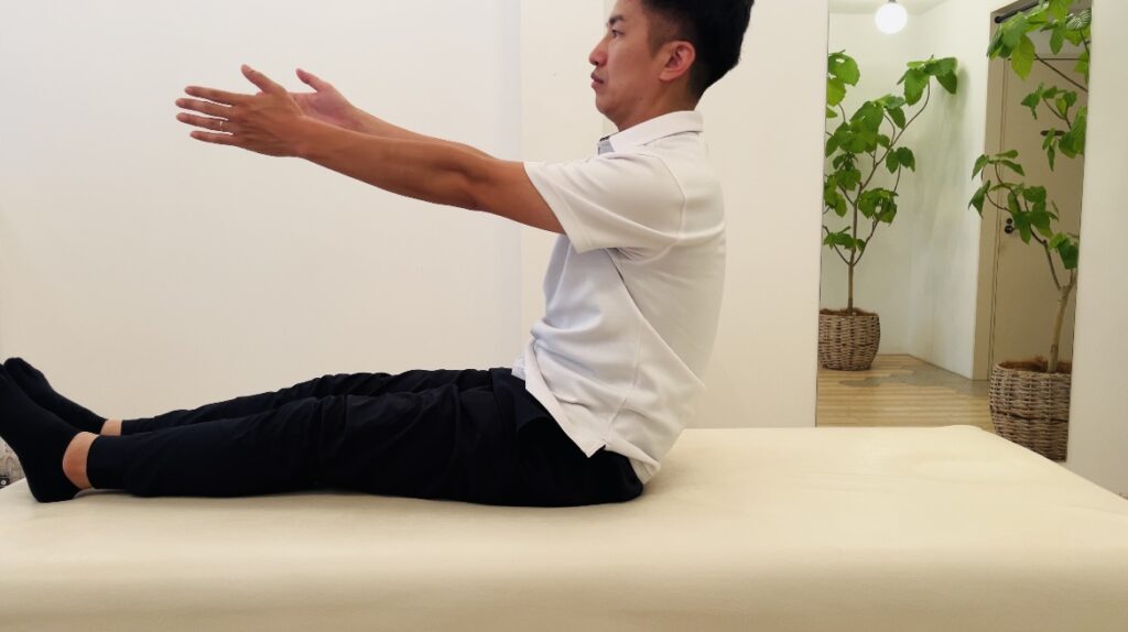膝を曲げた状態から、後方に体重移動して5秒キープします。