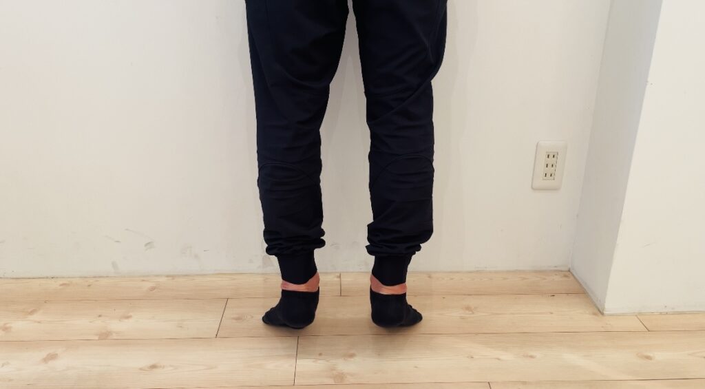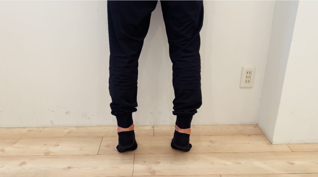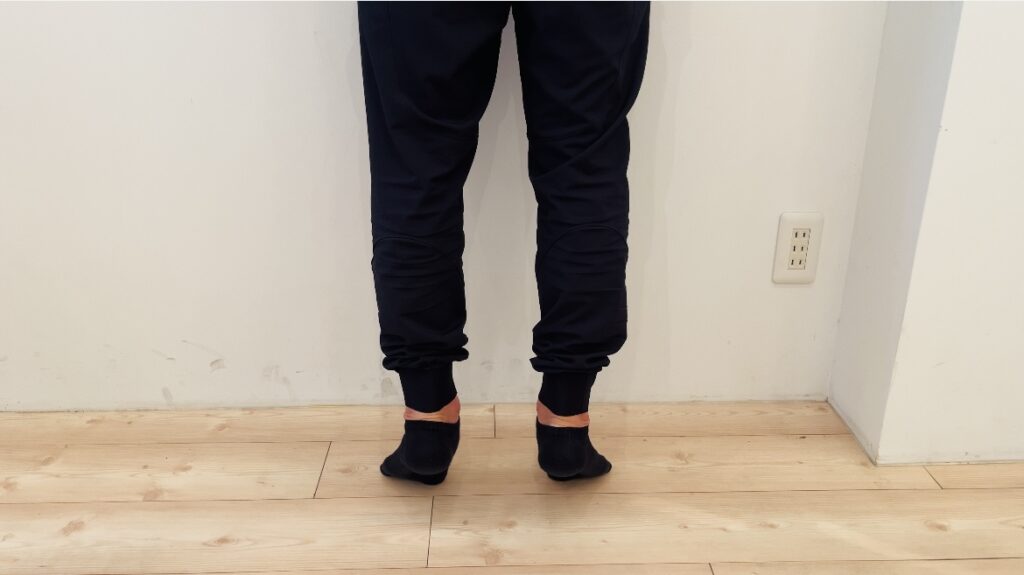 母趾球に体重をかけた状態から、出来るだけかかとを高く上げて5秒キープします。