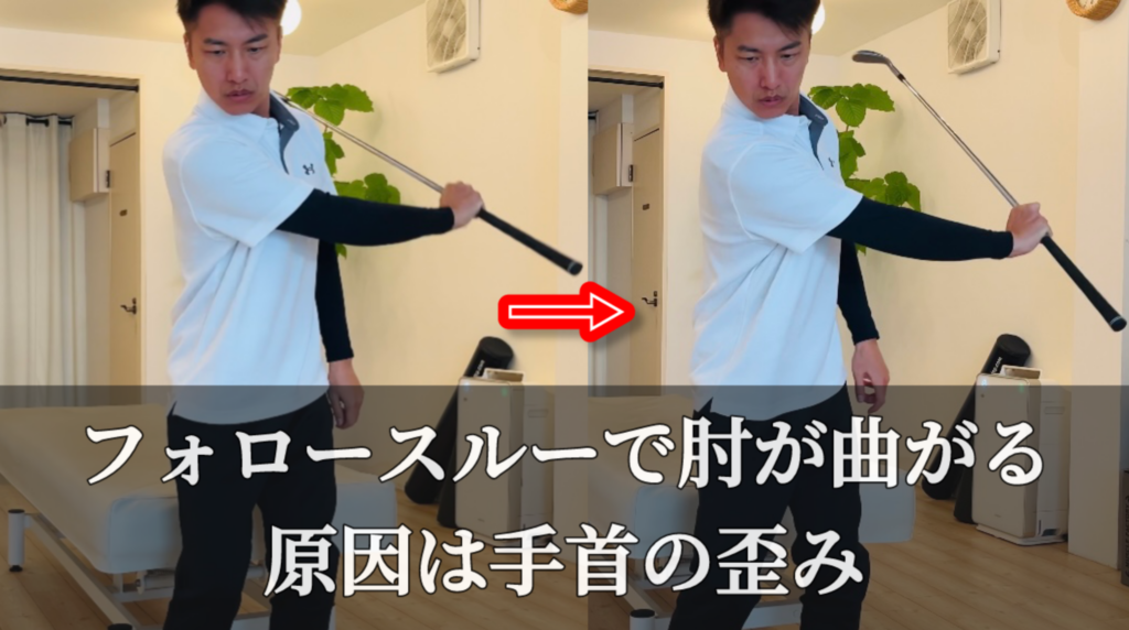 今回はヘッドが走らない原因の一つ、フォロースルーで肘が曲がりを改善しました。