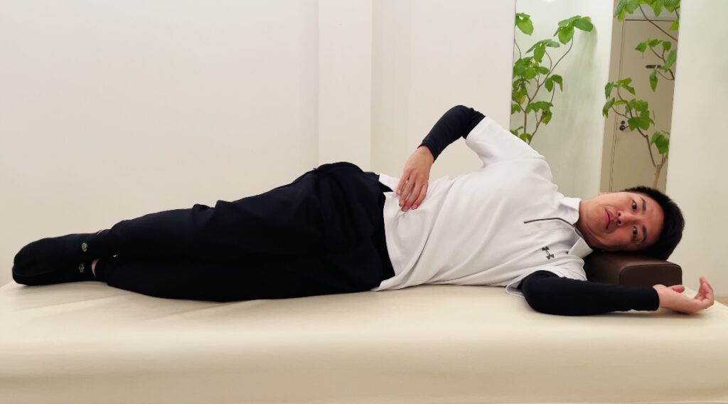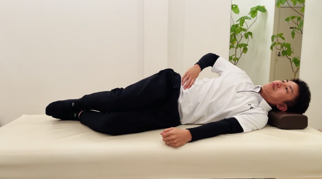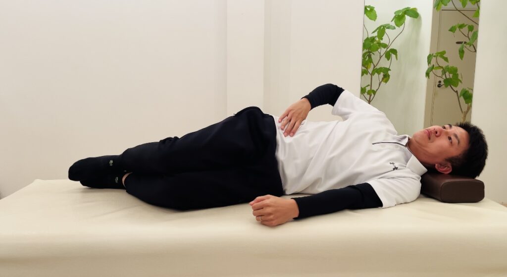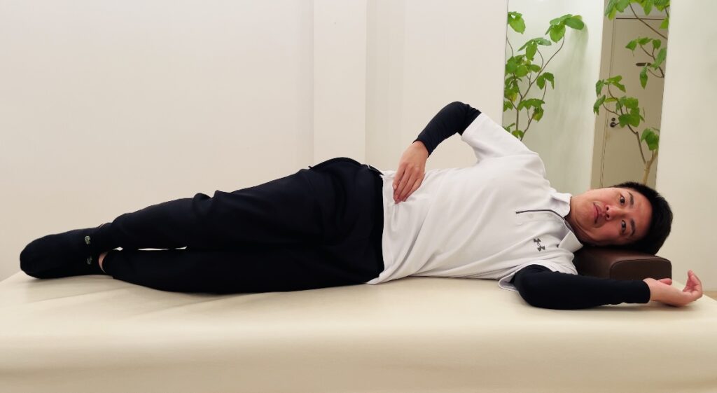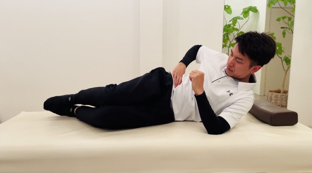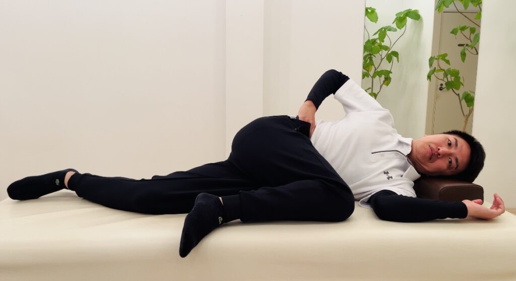 横向きで寝て膝を後方に伸ばします。伸ばした側のお尻とお腹に効けばOK、左右ともに行います。