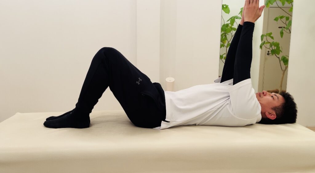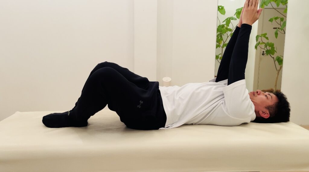 骨盤を引き上げた状態から、骨盤を前後に動かします。左右ともに行います。