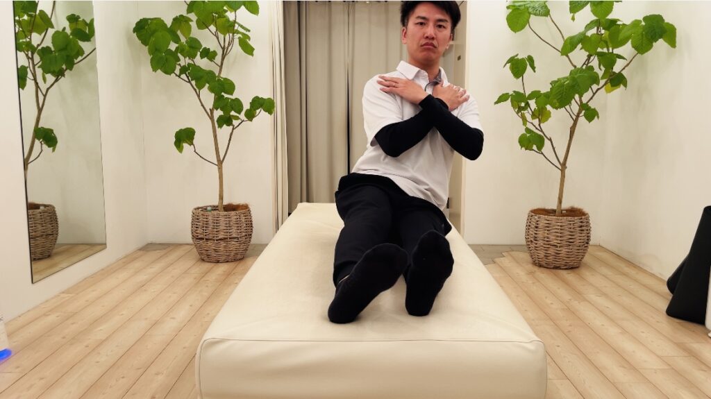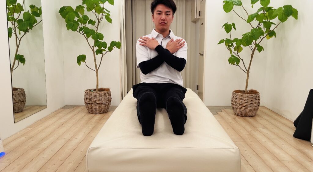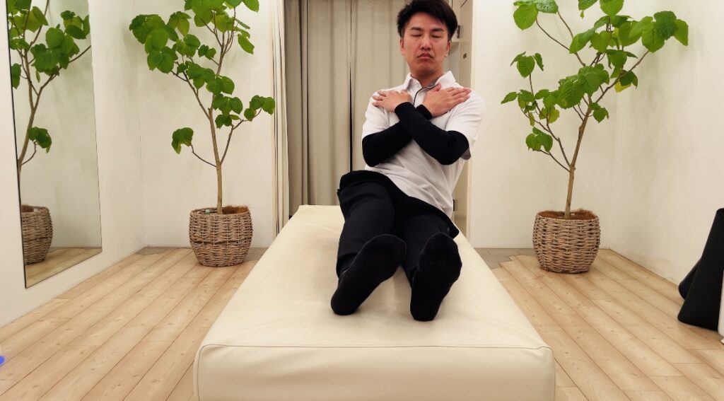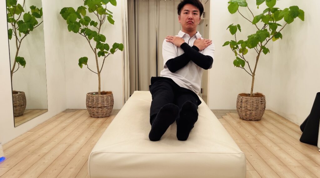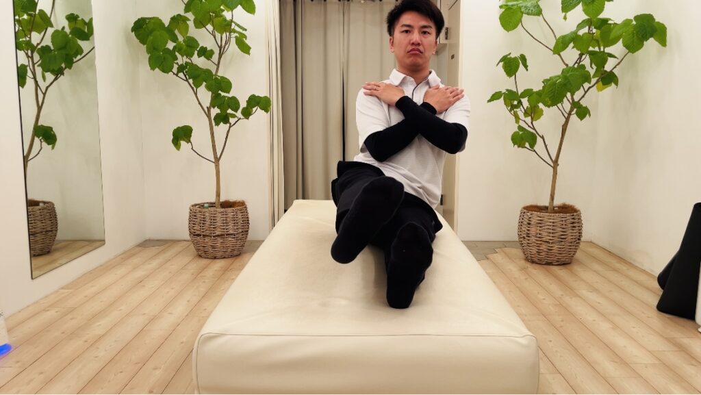 長座位から骨盤を引き上げて5秒キープします。左右ともに行います。