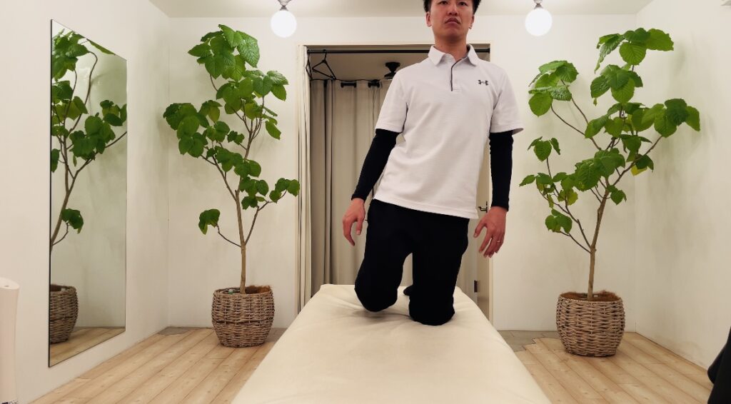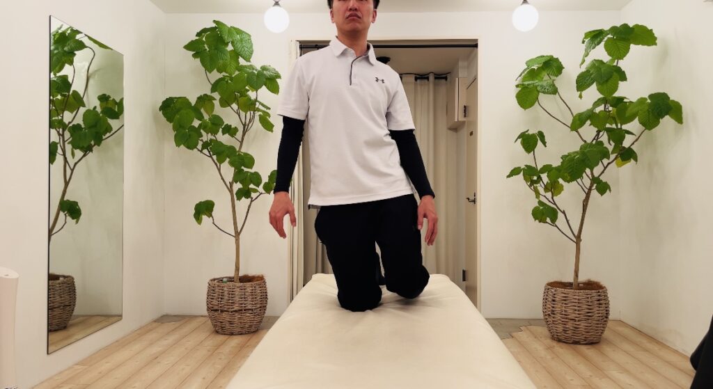 膝立ちの状態から、片足を浮かせて5秒キープします。浮かせた側の骨盤を引き上げと肩甲骨下制を意識します。