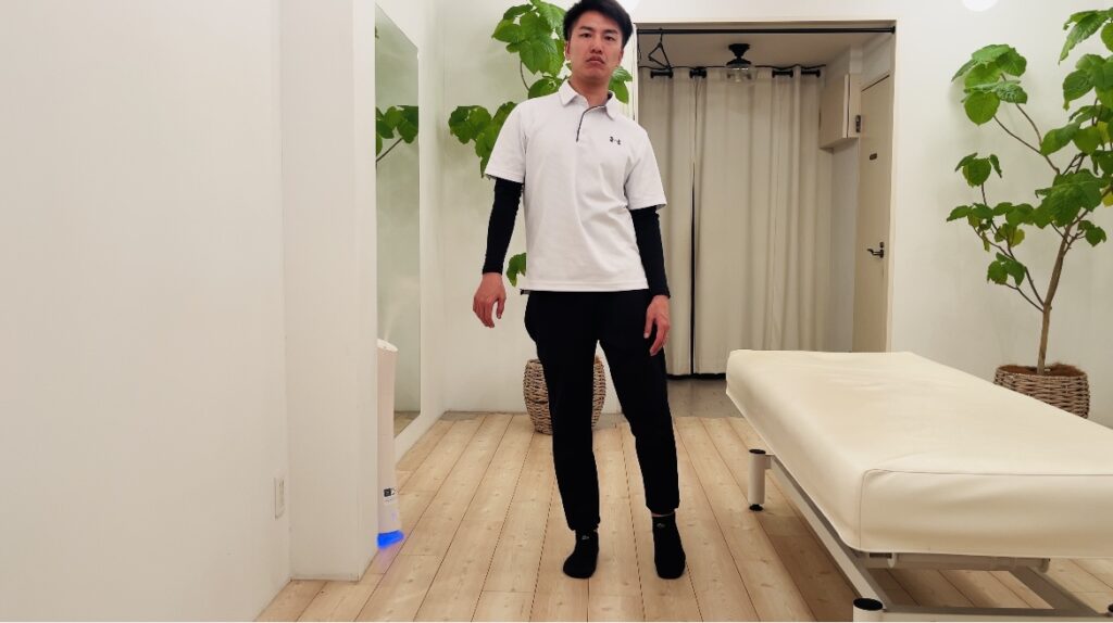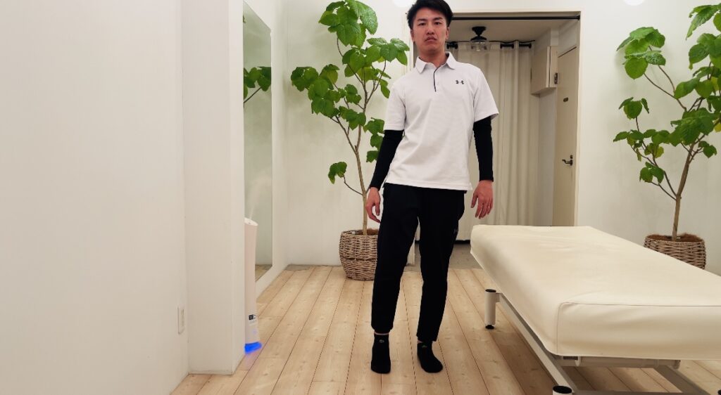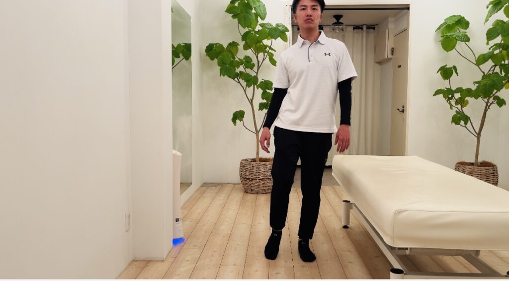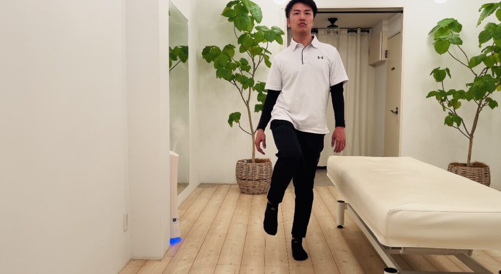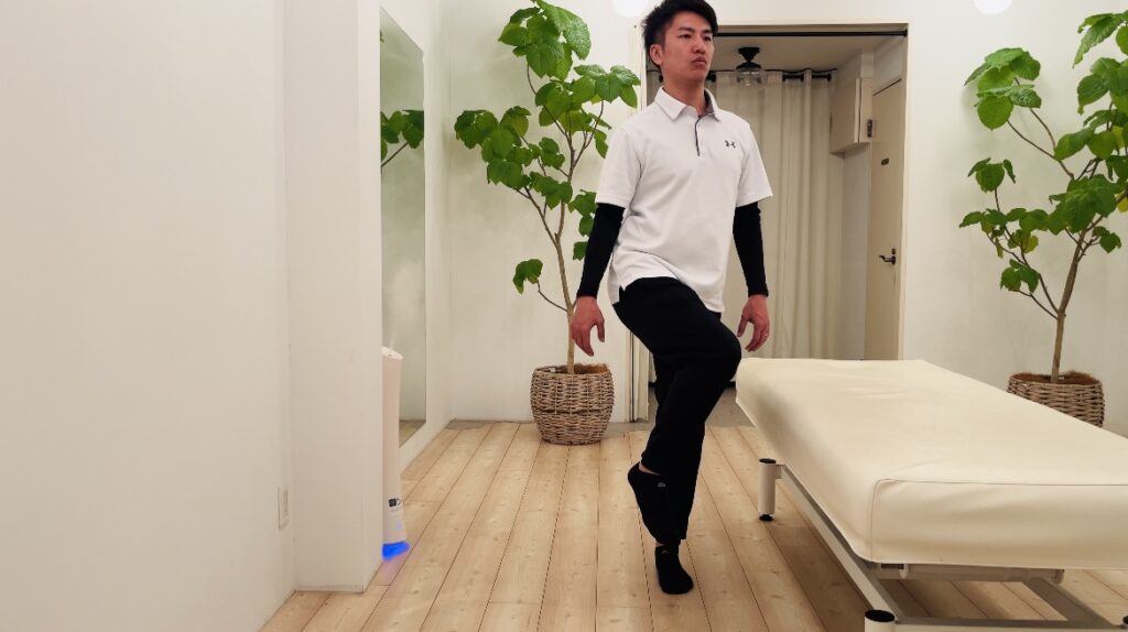 立位で骨盤挙上して5秒キープ、左右ともに行います。