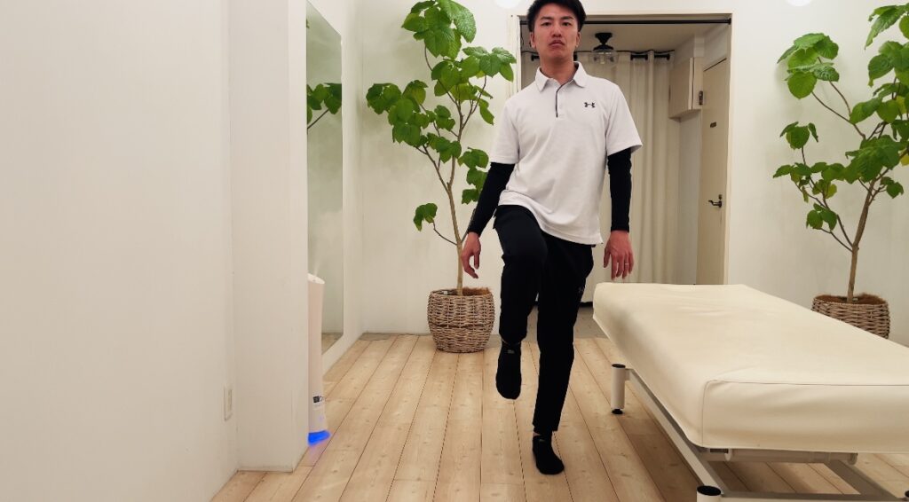 立位骨盤挙上した状態から、片足を上下に動かします。左右ともに行います。