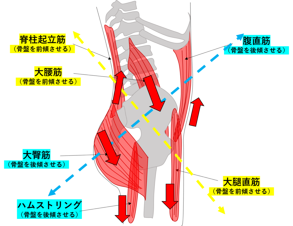 その筋肉は骨盤後傾する筋肉である腹筋や大臀筋、ハムストリングスです。