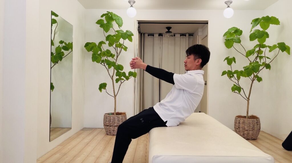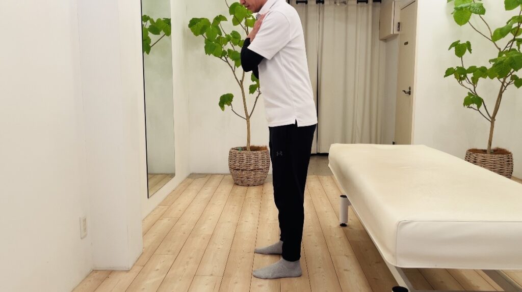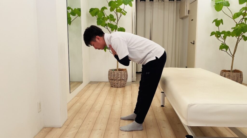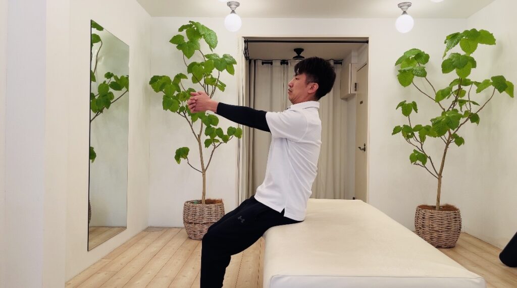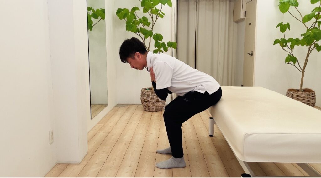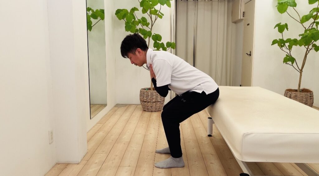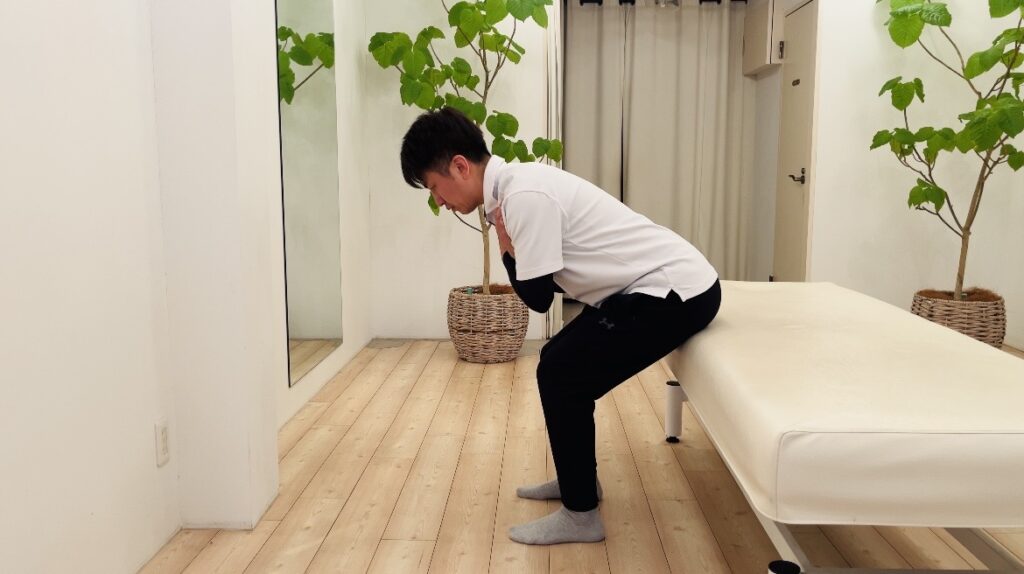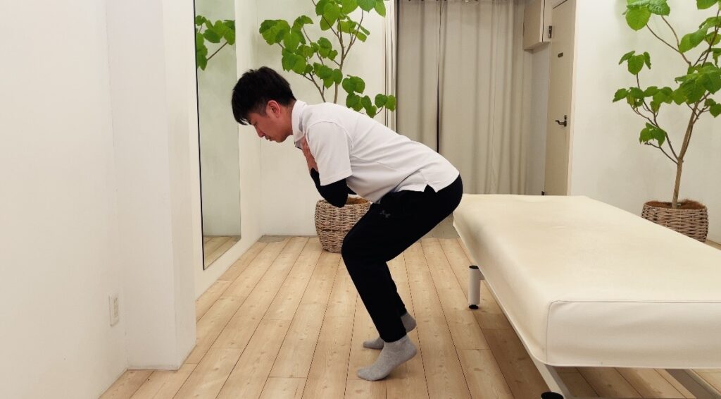 立位で体幹前傾して椅子に座るように、膝を曲げて5秒キープします。
