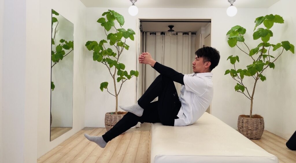 6の状態から膝を伸ばして5秒キープ、ゆっくり膝を曲げて戻ります。