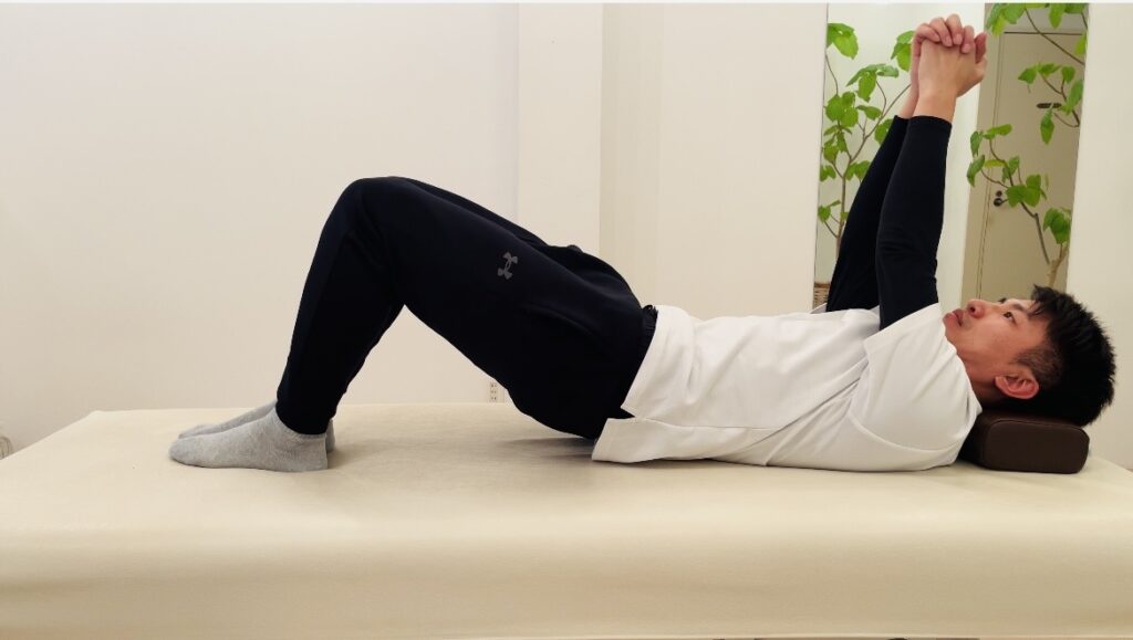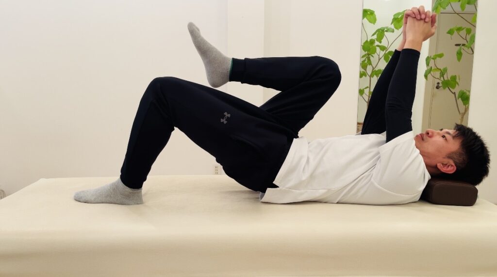 仰向けで腰を上げた状態から片足を深く曲げて5秒キープします。