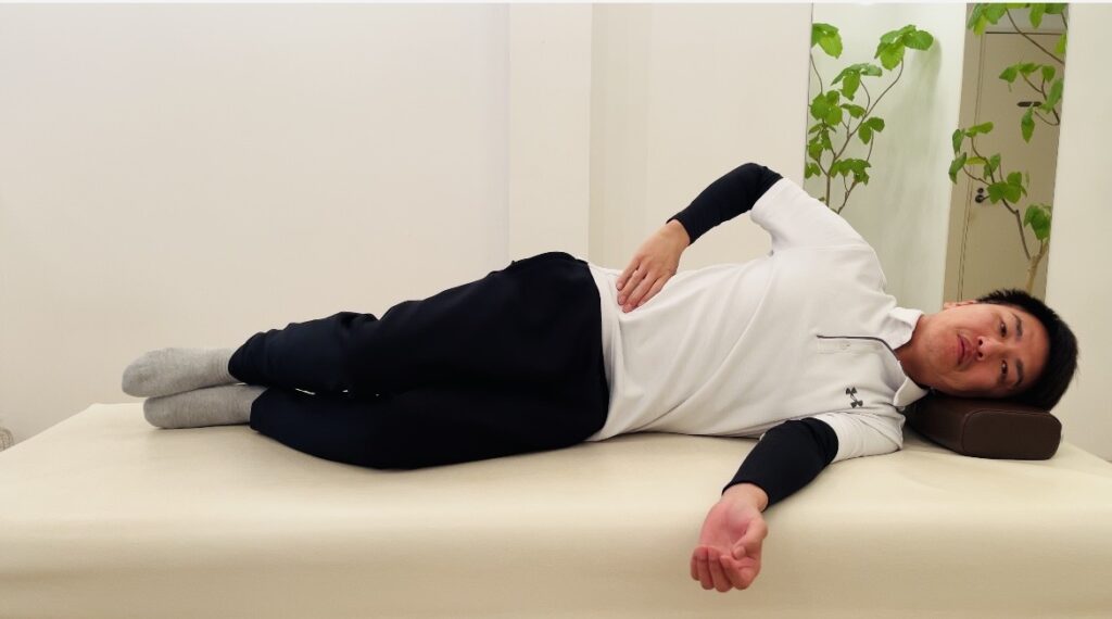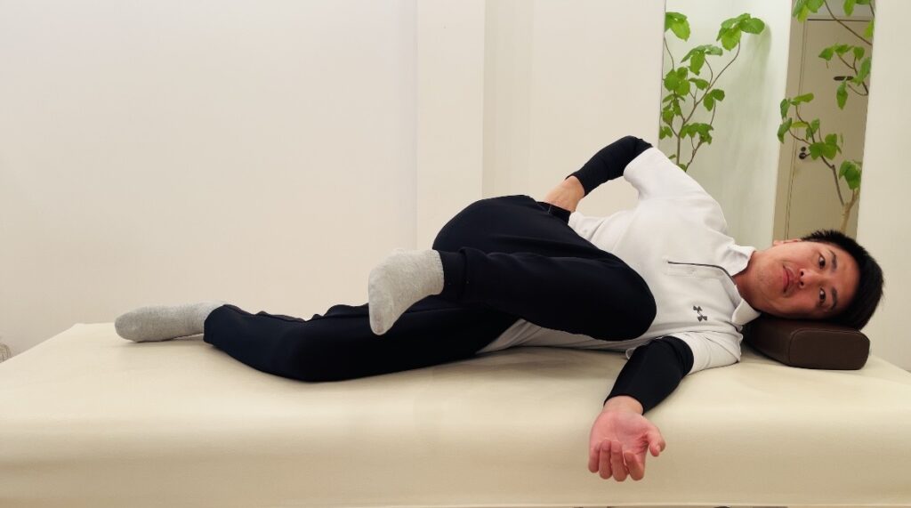 横向きで片足を深く曲げて5秒キープ、腹筋を意識して片足を後方に伸ばして5秒キープします。