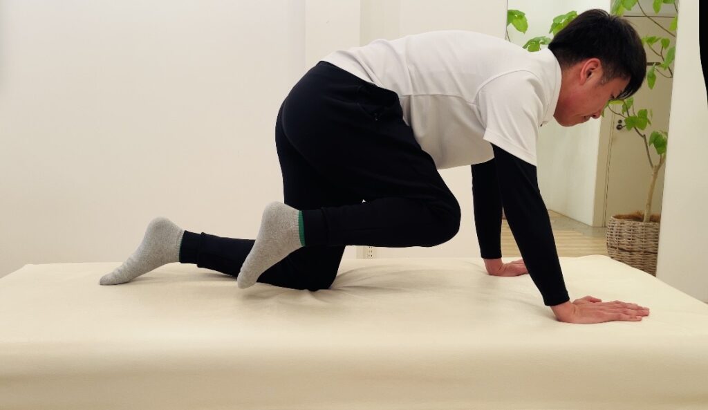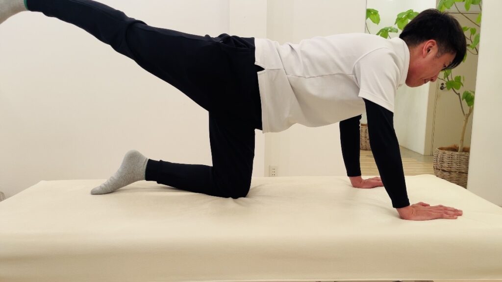 四つ這いで片足を深く曲げて5秒キープ、腹筋を意識して片足を後方に伸ばして5秒キープします。