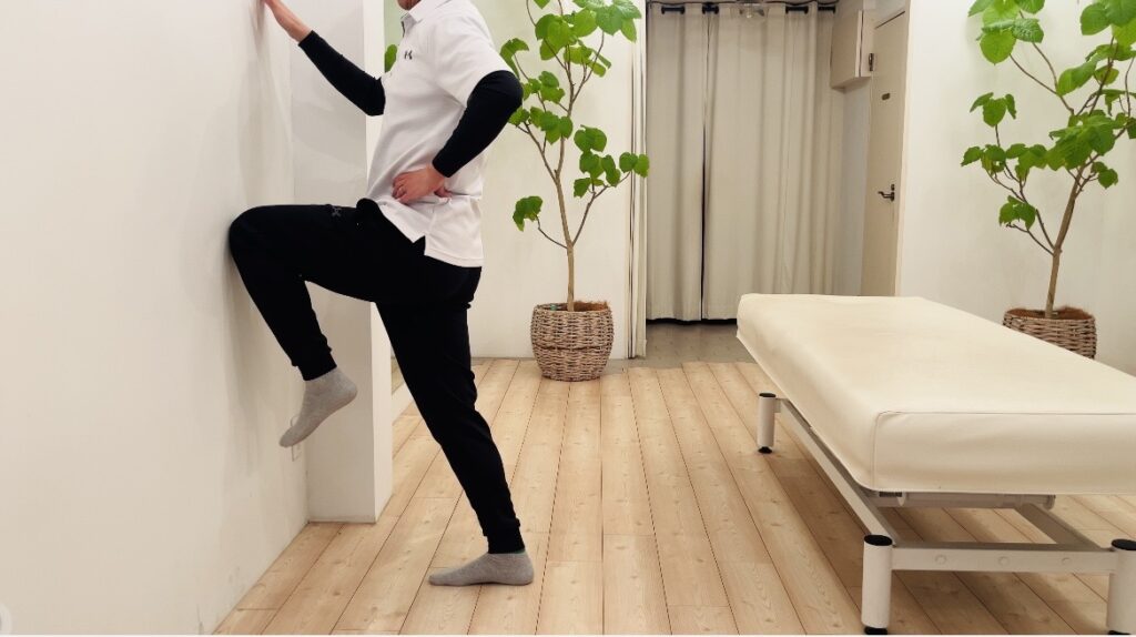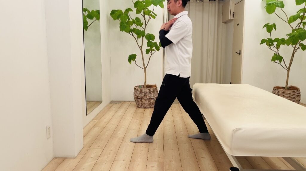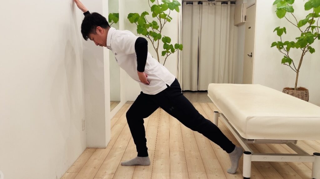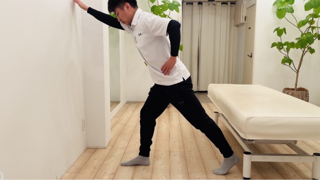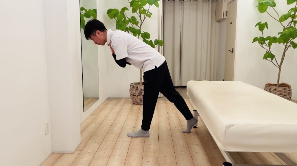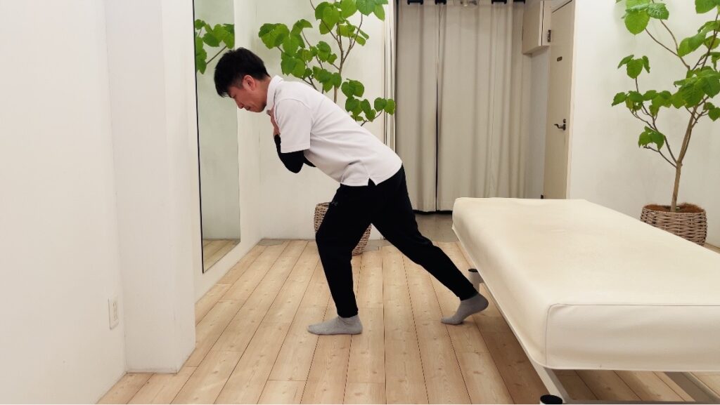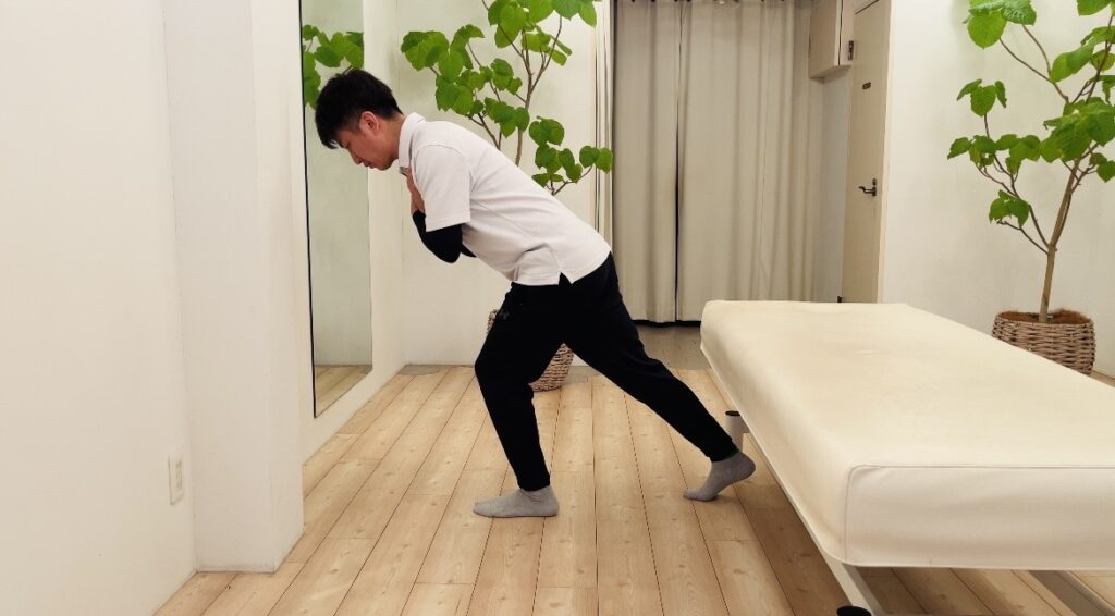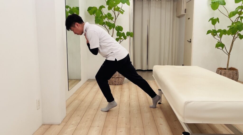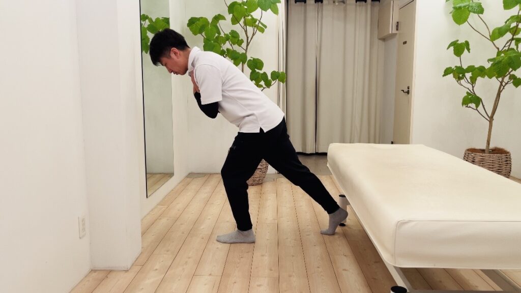 片足を前に出して、体幹前傾で膝を曲げて5秒キープします。